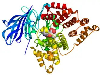 Crystallographic structure of LTA4H (rainbow colored N-terminus = blue, C-terminus = red) complexed with the protease inhibitor bestatin (space-filling model, carbon = white, oxygen = red, nitrogen = blue) based on the PDB: 1HS6​ structure.