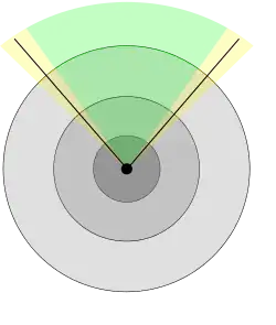 An example of various DLOD ranges. Darker areas are meant to be rendered with higher detail. An additional culling operation is run, discarding all the information outside the frustum (colored areas).