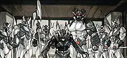 During the Dark Reign storyline, Leviathan attacks Agarashima, stronghold of Clan Yashida where Silver Samurai is attacked by mysterious, demonic warriors. After a small struggle, he is subdued. The black warrior plunges its claws into his face before determining that he does not have what they're looking for. The largest grabs the Samurai demanding to know where "the box" is. The same warriors then attack the Nemesis shipyards where Gorgon is and introduce themselves as members of Leviathan.[3]