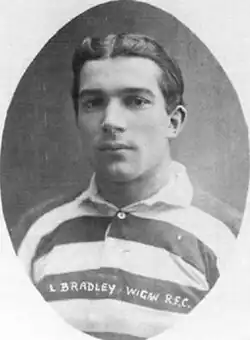 Bradley changed rugby football codes from rugby union to rugby league on 1 December 1911, signing a professional contract with Wigan.[2] He made his début on the following day in a 17–15 victory over Wakefield Trinity at Central Park. Scoring a try on his début, he was described by the Wigan Observer and District Advertiser as being "Quick off the mark he was often past his opposing threequarter before the latter realised Bradley had the ball. Shall we ever forget this speedy wing threequarter at Central Park? He was the idol of the crowd and it only seems like yesterday that he was dashing down the touchline, his long flowing hair blowing in the wind, those long raking strides, and that final natural swerve". At the end of his first season with the club, he played and scored a try against Huddersfield in the Championship Final at Thrum Hall, Halifax on Saturday 4 May 1912, but Wigan went on to lose the match 5–13.