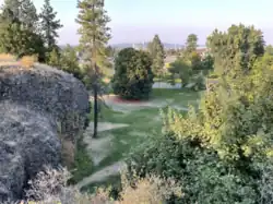 The park is located at the base of the slope of Spokane's South Hill, which rises over 100 feet as a sheer cliff along Liberty Park's southern edge. In the park's center is a basalt outcrop which also rises 100 feet to a flat-topped tableland.[8] These basalt rocks are part of the Columbia River Basalt Group, flood basalts laid down millions of years ago.[11] Almost all of the current iteration of the park is located east of the original park site,[8] which originally went only as far east as Perry St.[2]