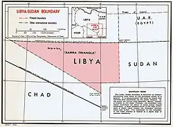 In 1925 Britain and Italy signed a boundary treaty, whereby the 22nd parallel north was utilised starting at the tripoint with Egypt and proceeding westward, terminating at the border between Italian Libyan and French Equatorial Africa (i.e. the modern Chad-Libya border).[3][2] The north-west corner of Anglo-Sudan Egyptian thus created was referred to as the Sarra Triangle; this latter area was ceded to Italy on 20 July 1934, and the boundary re-drawn at its current position.[2] On 7 January 1935 France and Italy signed a treaty which shifted the French Equatorial Africa-Libya boundary southwards (creating the Aouzou Strip, thereby also shifting the Libya-Sudan southwards slightly, however this agreement was never formally ratified by both parties and was thus never implemented.[7][2]