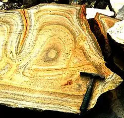 Liesegang ring patterns are considered to be secondary (diagenetic) sedimentary structures, though they are also found in permeable igneous and metamorphic rocks that have been chemically weathered.[7] Chemical weathering of rocks that leads to the formation of Liesegang rings typically involves the diffusion of oxygen in subterranean water into pore space containing soluble ferrous iron.[7] Liesegang rings usually cut across layers of stratification and occur in many types of rock, some of which more commonly include sandstone and chert.[3] Though there is a high occurrence of Liesegang rings in sedimentary rocks,[6] relatively few scientists have studied their mineralogy and texture in enough detail to write more about them.[13] Liesegang rings are referred to as examples of geochemical self-organization, meaning that their distribution in the rock does not seem to be directly related to features that were established prior to Liesegang ring formation.[14] For instance, in certain types of sedimentary rocks such as carbonate siltstones (calcisiltites), Liesegang ring patterns can be misinterpreted for faults; the rings may appear to be "offset," however the laminae in the rock exhibit an unbroken pattern, therefore the observed offset is attributed to pseudofaulting.[7] Pseudofaults are the result of Liesegang rings developing within areas of the rock that are adjacent to each other but at varying stratigraphic levels.[7] Liesegang rings can have the appearance of fine lamination and can be mistaken for laminae when parallel or subparallel to the bedding plane, and are more easily differentiated from laminae when the rings are observed cutting across beds or lamination.[2]