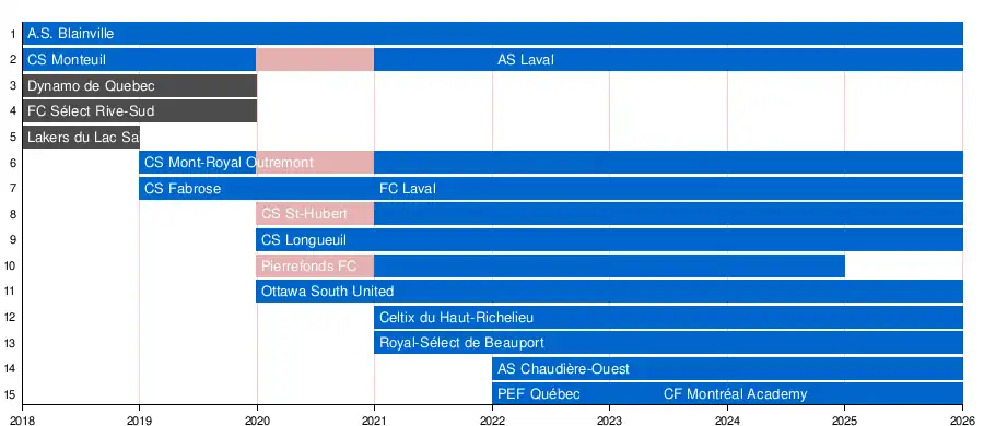 Over the course of its history, various clubs have joined and departed the league. AS Blainville is the only club to have participated in every season since the league's inception.[15]