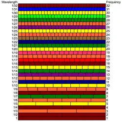 First 32 harmonics, with the harmonics unique to each limit sharing the same color.