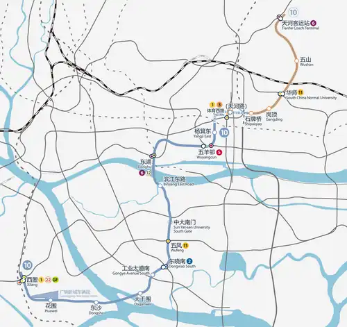 Line 10 of the Guangzhou Metro is a 17.2 km (10.7 mi) rapid transit rail line in operation in Guangzhou. Line 10 connects Tianhe with Liwan via Haizhu. Line 10 mainly runs parallel in-between Line 2 and Line 3 in Haizhu.