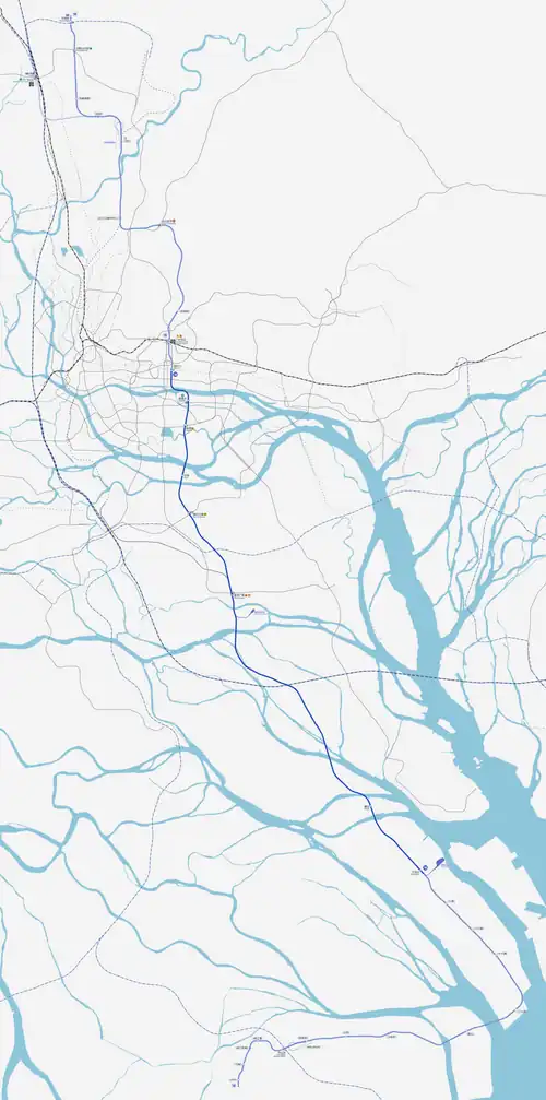 The 61.3 km (38.1 mi) line, roughly north-south, connects Wanqingsha in Nansha District with Guangzhou East Railway Station, with only seven stations in between, Hengli, Panyu Square, Nancun Wanbo, Shaxi, Longtan, Modiesha, Xiancun.[3] The line uses 8-car Type D trains with an operating speed of 160 km/h (99 mph).[8] This high speed can be sustained especially on the 26 km (16 mi) section between Panyu Square and Hengli stations.
