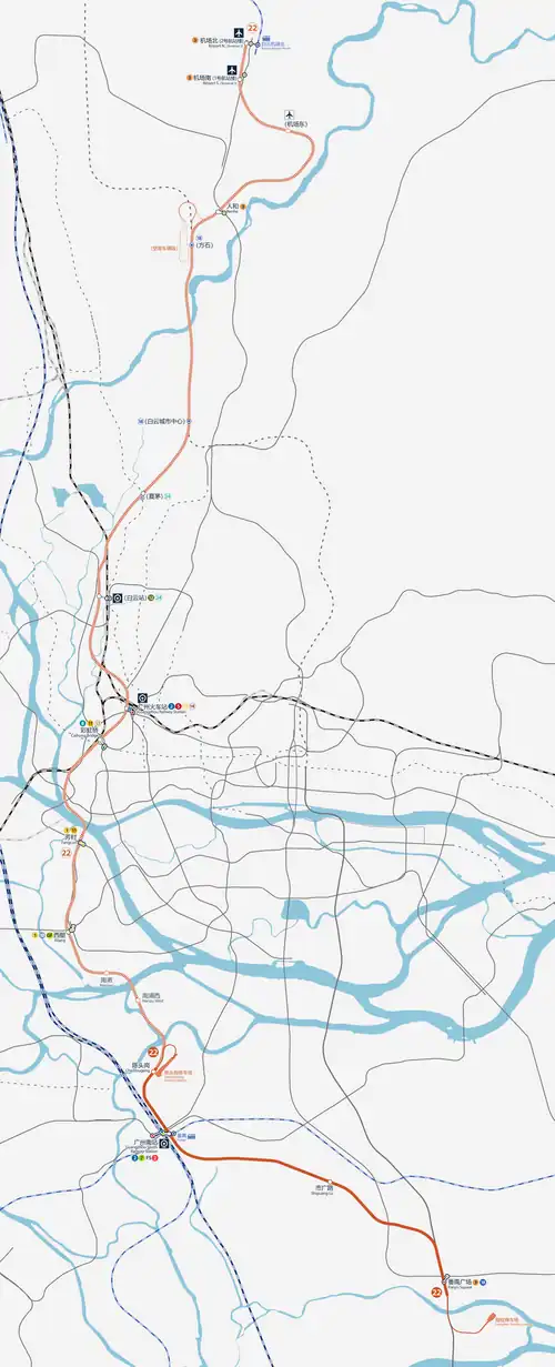 广州地铁22号线北延段,线路起于芳村站(不含),止于机场北站,线路长约41.1公里,全地下敷设。新建10座车站