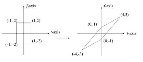Scaling, , corresponds to scaling the time and frequency dimensions inversely (as time goes faster, frequencies are higher and the time dimension shrinks):