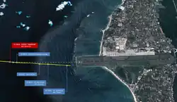 ![]() The Boeing 737 as it came to rest after impacting the shallow waters | |