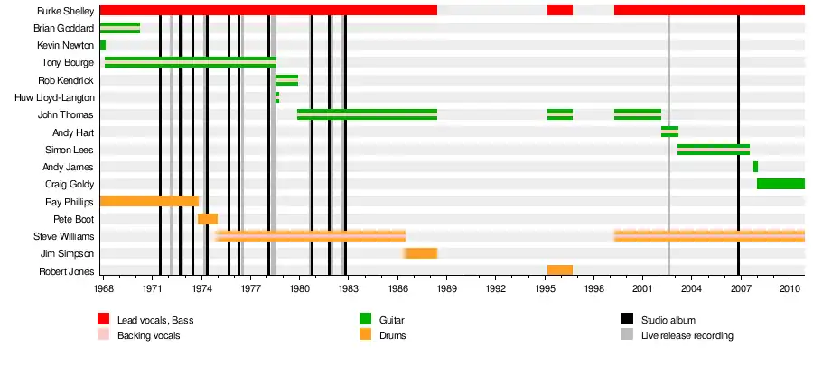 Lees performed on 2006's You're All Living in Cuckooland, Budgie's first studio album since 1982.[15] He later left in July 2007, with Andy James taking his place in October.[16] By January 2008, James had been replaced by Dio guitarist Craig Goldy on a part-time "special guest" basis.[17] In November 2010, Budgie were forced to cancel a European tour after Shelley suffered an aortic aneurysm for which he underwent surgery.[18] The band have not performed since, with Shelley announcing in 2020 that his condition had worsened, and that he planned to release a final album of unreleased Budgie tracks.[19] Shelley died on January 10, 2022, aged 71, in his hometown of Cardiff.
