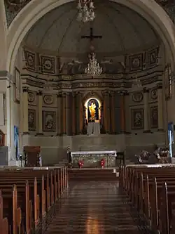 The main and side retablos are in Neo-classical design. The image of San Isidro Labrador is enthroned in the high main altar. The image of Saint Joseph is enthroned in the gospel retablo while the image of the secondary patron, Our Lady of the Most Holy Rosary, is enthroned in the epistle retablo.