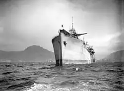 Empire Trooper was a 14,106 GRT ocean liner which was built by Vulkan Werke, Hamburg. Completed in 1922 as Cap Norte for Hamburg Südamerikanische Dampfschiffahrts-Gesellschaft. Chartered in 1932 to Norddeutscher Lloyd and renamed Sierra Salvada, returned to Hamburg Süd in 1934 and renamed Cap Norte. When war was declared, she was homeward bound from Pernambuco, Brazil. Her passengers were disembarked in Lisbon. She was painted to represent a Swedish ship, carrying Swedish colours and renamed Ancona. Departed for Germany via a circuitous route but spotted on 9 October 1939 by HMS Belfast north-west of the Faroe Islands in rough weather. Her captain surrendered her and she was escorted to Scapa Flow. Used as a blockship there until HMS Royal Oak was torpedoed there and served that purpose. To MoWT in 1940 and renamed Empire Trooper, converted to a troopship. Damaged on 25 December 1940 by shelling from Admiral Hipper, which was driven off by HMS Berwick. Refitted in 1946, and again in 1950. Arrived on 9 April 1955 at Southampton on her last trooping duty from Hong Kong. Scrapped in September 1955 at Inverkeithing, Fife.[35]