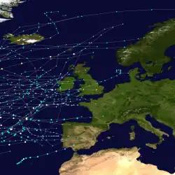 Advanced meteorological observation stations and ship reports allowed Atlantic hurricanes to be tracked for extended durations, including to the European mainland in some cases, beginning in the 1860s. Most storms that affected Europe have done so from August to October, which is the climatological peak of the Atlantic hurricane season. In a survey of such European tropical cyclones from 1961 to 2010, Dr. Kieran Hickey observed that the storms generally formed west of Africa and recurved to the northeast, or formed off the east coast of the United States and proceeded eastward. Ireland and the United Kingdom experience the most effects, due to their positions far to the west of the rest of Europe. Countries that are as far to the east as Estonia[4] and Russia[5] have experienced tropical cyclone impacts.