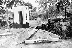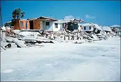 - August 24, 1992 – Hurricane Andrew makes landfall on Homestead, just south of Miami, as a Category 5 hurricane with winds of 165 mph (265 km/h).[64] The winds destroy 25,524 homes and damage 101,241 others in southern Florida, leaving up to one-quarter million people temporarily homeless. In Homestead, more than 99% of all mobile homes are completely destroyed. Hurricane Andrew causes $25.5 billion in damage (1992 USD, $39.2 billion 2008 USD) in south Florida and 15 direct deaths. At the time, Andrew was the costliest North Atlantic hurricane in the history of the United States, though has since dropped to eighth after Hurricanes Katrina, Ike, Irma, Maria, Sandy, Ida and Harvey.[65][66]