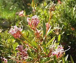 | 'Pretty Pink' | Grevillea arenaria x G. 'Crosbie Morrison'. Introduced in Victoria in 1985. | [2] | ||