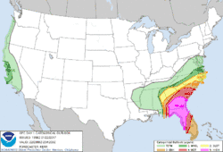A high risk severe weather event is the greatest threat level issued by the Storm Prediction Center (SPC) for convective weather events in the United States. On the scale from one to five, a high risk is a level five. A high risk is usually for major tornado outbreaks with numerous strong to violent tornadoes expected, and occasionally derechos with widespread destructive wind gusts, and these outlooks are typically reserved for the most extreme events.[1] They are generally only issued on the day of the event. However, there have been three occurrences (April 7, 2006, April 14, 2012, and March 15, 2025) of a high risk being issued for Day 2 of the outlook period (with the event occurring the following day). Under the official protocol, a high risk cannot be issued for Day 3 of the outlook period.[2]