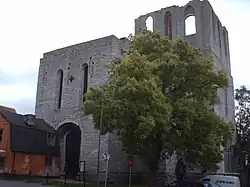 The church of Saint Catherine was the church of a Franciscan convent. The convent was founded in 1233 and a first construction period took place c. 1235–1250. During the early 14th century reconstruction work on the church began, and was not finished until 1412, when the church was re-inaugurated. The abbey was disbanded during the 1520s, and the buildings were for a short while used as an almshouse before being completely abandoned.[8][9] |