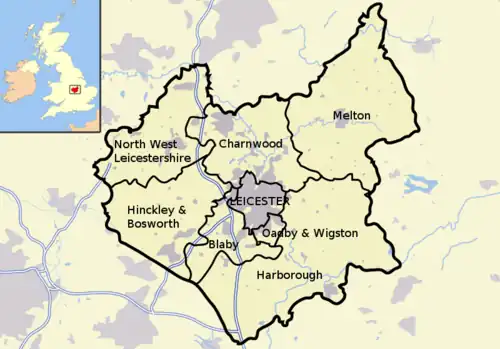 The districts of Leicester and Oadby and Wigston (Oadby and Wigston) are entirely unparished. Coalville, Hinckley, Loughborough, Market Harborough and Melton Mowbray are also unparished.