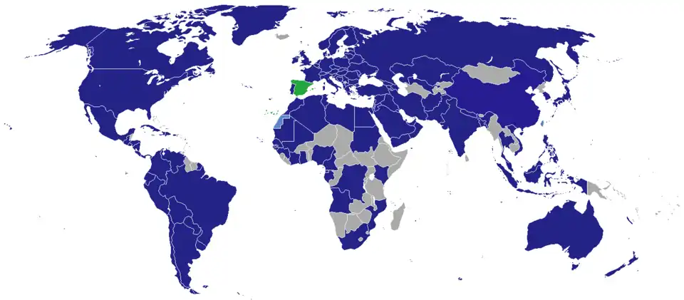 - ^ a b c d e f g h i j k l m n o p q r s t u v w x y z aa ab ac ad ae af ag ah ai aj ak al am an ao ap aq ar as at au av aw ax ay az ba bb bc bd be bf bg bh bi bj bk bl bm bn bo bp bq br bs bt bu bv bw bx by bz ca cb cc cd ce cf cg ch ci cj ck cl cm cn co cp cq cr cs ct cu cv cw cx cy cz da db dc dd de df dg dh di dj dk dl dm dn do dp dq dr ds dt du dv dw dx dy dz ea eb ec ed ee ef eg eh ei ej ek el em en eo ep eq er es et eu ev ew ex ey ez fa fb fc fd fe ff fg fh fi fj fk fl fm fn fo fp fq fr fs "Lista del Cuerpo Diplomático" [List of the Diplomatic Corps] (PDF) (in Spanish). Ministry of Foreign Affairs (Spain). 28 October 2024. Retrieved 9 January 2024.