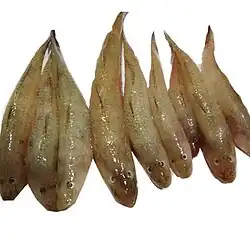 Bengali also has a generic term for three related fish species from the family Polynemidae. A lakkha fish (লাক্ষা মাছ) may be Eleutheronema tetradactylum, Leptomelanosoma indicum or Polydactylus sexfilis.[4] Another example is that of tengra (টেংরা) which is used to denote several species of catfishes from the families Mystus and Batasio.[5][6][a]