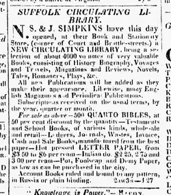 - Suffolk Circulating Library; corner of Court and Brattle St.; N.S. Simpkins, J. Simpkins[29]