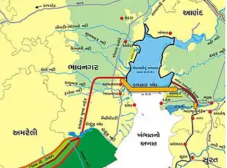 It is a huge freshwater coastal reservoir for drinking, Irrigation, and Industrial purposes. Also, a 10-lane road will be created on the dam which will reduce the distance between South Gujarat and Saurashtra. Once completed it will be the world's largest freshwater lake in a marine environment.[139]