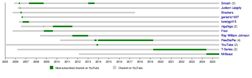 - ^ "Most Subscribed Channels - All Time". www.youtube.com. YouTube. Archived from the original on November 20, 2006. Retrieved June 10, 2024.
