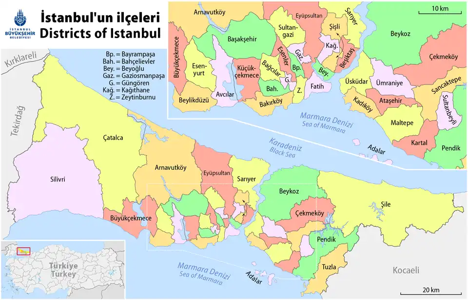 This is a list of neighbourhoods (Turkish: mahalle) of Istanbul, Turkey, classified by the districts of Istanbul. Neighbourhoods are not considered an administrative division of the districts, but they have legally established borders and a "head man" (called muhtar in Turkish) who are elected by universal suffrage and have minor duties like certifying copies of certain documents, especially one related to the "official residence" of the people living in the neighbourhood. (Turkish legislation requires presenting an official "certificate of residence" for several needs of the citizens and resident foreigners alike; such as enrolling in electoral registers or for applying to a job that requires being a resident of the concerned district or province, or for requesting certain public or municipal services.)