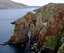 60°15′46″N 1°41′58″W / 60.26278°N 1.69944°W | Walls and Sandness, Shetland | 60m[55] | May be related to Old Norse: kléi originally meaning steatite although there is no certain connection.[56] | There are two large stacks here. The eastern one reaches 55m but it is probably not completely seagirt.[57] Both have natural arches.[43] |