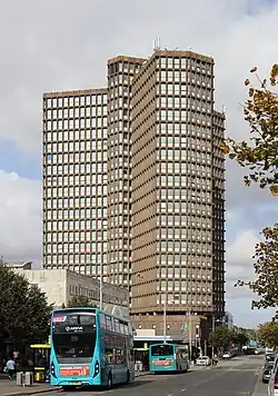 This list of the tallest buildings and structures in Liverpool ranks high-rise structures in Liverpool, England, by height (buildings in the wider Liverpool Urban Area are listed separately within the article). The tallest building in Liverpool is currently the 40-storey West Tower, which rises 140 metres (459 ft) on Liverpool's waterfront. It is also the tallest habitable building in the United Kingdom outside of London, Birmingham and Manchester.[1] Liverpool is a city undergoing mass regeneration, with older buildings being demolished to make way for new developments. During the mid-2000s, ten 1960s apartment blocks over 50 metres (164 ft) tall in the city were demolished.[2]