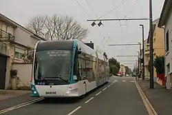 Note: The former TVR, or GLT, system in Caen and the Translohr system in Clermont-Ferrand are not listed, as they are not commonly considered to be trolleybus systems,[4][5] since their vehicles use(d) pantographs to collect current and therefore were not able to operate away from the surface guideway while remaining in electric mode. The GLT vehicles formerly used on the Nancy system, by comparison, were able to do so, as they used trolley poles to collect current, so the Nancy system continued to be considered a trolleybus system during its GLT era.[4]