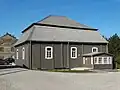 The synagogue is a wooden log structure of rectangular plan, built on a rough-stone concrete foundation and divided into two floors in the west. The structure is spanned with a hipped rafter roof covered with tin. On the exterior, the building is protected with horizontal weather-boarding above the windowsills of the prayer hall, and a vertical one below them.[13] A prayer hall of almost square plan is situated on the eastern side. On the western side, the building includes a vestibule and a small room with a stove, which also heated the prayer hall. A staircase in the southwestern corner leads to a women's section on the first floor, which opens to the prayer hall with two long rectangular windows. The main entrance to the building is in the western wall and the women's entrance is on the southern wall. Ten round-headed windows opened from the prayer hall: three windows on the southern and northern walls and two pairs of windows on the eastern wall. The windows of the vestibule and the women's section are rectangular. The ceilings are joisted flat constructions; that of the prayer hall is supported by two large beams, resting on the western wall of the women's section and the eastern wall of the prayer hall.[14] |