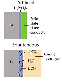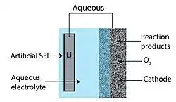 In aqueous cells problems at the SEI stem from the high reactivity of lithium metal with water.[26]