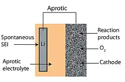 Most efforts involved aprotic materials, which consist of a lithium metal anode, a liquid organic electrolyte and a porous carbon cathode.[3] The electrolyte can be made of any organic liquid able to solvate lithium salts such as LiPF