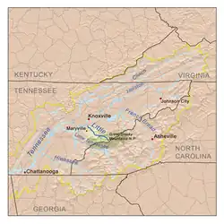 Historically, the Little River lay in a region of contact between the Overhill Cherokee and the American colonies, later states, during the Cherokee–American wars that emerged from combined pressures of colonies' demands for settlement beyond the Proclamation Line of 1763 and loss of land by the Cherokee in their traditional homelands. In 1785, the self-proclaimed State of Franklin negotiated the Treaty of Dumplin Creek, which set a boundary with the Cherokee leader Aucoo of Chota and other Cherokee town chiefs whom Aucoo spoke on behalf of, at the ridge separating the Little River and Tennessee basins.[6] In 1786, Houston's Station on the Little River was the site of assembly for a volunteer cavalry force, who, under the leadership of Governor John Sevier, a chief signatory of the Dumplin Creek treaty, rode to destroy three Cherokee towns in the vicinity of the Hiwassee River in retaliation for a Cherokee attack on a settler's house that killed two people north of the Holston River near present-day Knox County, beyond the boundary set by the Dumplin Creek treaty.[a] Deep within Cherokee territory, the detachment withdrew after hearing rumors of a superior force approaching, perhaps organized by John Watts.[7]: 340–343