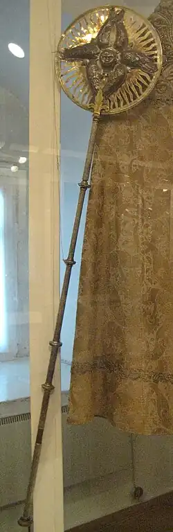 Fans are carried by the altar servers at all processions with Eucharistic gifts and the Gospel Book.[4] However, in the Russian tradition they are often also used to honor a particularly sacred icon or relic. When not in use, the fans are usually kept in stands behind the Holy Table, although in Slavic traditions they may be kept out of sight elsewhere in the altar,[5] especially in northern Russia, where icons of Christ and the Theotokos are usually placed behind the Holy Table.