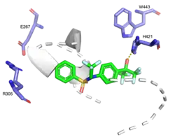 Crystal structure of human liver X receptor α (LXRα) also forms a heterodimer with its partner retinoid X receptor β (RXRβ). The LXRα-RXRβ heterodimer (PDB 1UHL) binds synthetic LXR oxysterol agonist T-0901317. The ligand-binding pocket predominantly consists of hydrophobic residues. The most critical residues to the binding pocket include E267, R305, H421, and W443. The binding pocket accommodates oxysterols of molecular volumes up to 400 Å3 and T-0901317 easily positions itself with a molecular volume of 304 Å3. H421 forms a hydrogen bond with T-0901317's hydroxyl head group which lowers the pKa of the H421 imidazole side chain. As a result, the imidazole side chain interacts electrostatically with π-electrons of W443's indole side chain to stabilize the active conformation of the helices.[9]