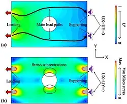 In the image to the right, a structural member with a central hole is placed under load bearing stress. Figure (a) shows the U* distribution and the resultant load paths while figure (b) is the von Mises Stress distribution. As can be seen from figure (b), higher stresses can be observed at the vicinity of the hole. However, it is unreasonable to conclude the main load passes that area with stress concentration because the hole (which has no material) is not important for carrying the load. The stress concentration caused by the structural singularities like a hole or a notch makes the load transfer analysis more difficult.
