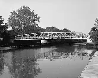 The swing bridge on Locke Avenue over the Raccoon Creek was 154 feet 6 inches (47.09 m) long. It was a single-lane, center pivot swing bridge that carried vehicular traffic over Raccoon Creek. The swing span was designed to manually rotate at its center pivot pier, which allowed marine traffic to pass underneath. It was constructed in 1911.[1] The swing span had been locked in the closed position since 1971. The main channel of the Raccoon Creek was under the northern span of the bridge and has not been dredged since April 1965.