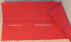 Ideally, the lockstitch is formed in the center of the thickness of the material — that is, ideally the upper thread entwines the lower thread in the middle of the material. The thread tension mechanisms, one for the upper thread and one for the lower thread, prevent either thread from pulling the entwine point out of the middle of the material.