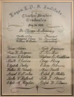 Construction on the Logan Institute began in 1928 as the first institute of religion in the state of Utah.[1] When the building was completed, it was dedicated by LDS Church president Heber J. Grant on Easter Sunday, March 31, 1929.[3] When it opened, there was a total enrollment of 114 students and offered two classes: Bible Literature and Moral Philosophy. The institute's first class graduated on May 26, 1935, and had 21 students.[5] Thomas C. Romney was the first institute director and the only instructor until Milton R. Hunter was hired in 1936.