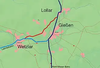 The 18.04 km long Lollar–Wetzlar line was built as a bypass for Gießen. The line separated in Lollar from the Main-Weser Railway coming from the north and ran directly to Wetzlar, where the Cannons Railway continued over the Lahntal railway to the west. This work was built under the leadership of Julius Lehwald.