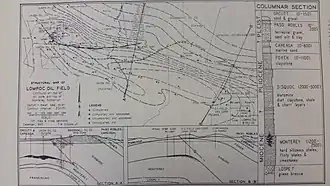 With the success of the drilling in the Los Angeles Basin around 1900, and similar discoveries of oil in Kern County around the same time, prospecting for oil began to occur in Santa Barbara County as well. In 1901 the Orcutt field was discovered, and in 1903 the discovery well for the Lompoc field was drilled, after several failed attempts to find oil in the obviously promising anticlinal structure. A 1902 well was wrecked in an earthquake before it found oil.[8] The discovery well, by the Union Oil Company of California, hit oil in March 1903, and initially produced 225 barrels per day (35.8 m3/d).[9] By 1911, the field had 33 producing wells on the field, six in the process of being drilled, and 15 had already been abandoned, either as dry holes or insufficient producers.[10] Union Oil Company of California's 1905 Well, Hill 4 was the first oil well in which a shutoff was attained by pumping cement through the tubing and back of the casing.[11]