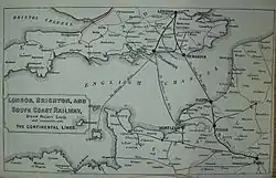 The LB&SCR supported the independent Surrey and Sussex Junction Railway, which obtained powers in July 1865 to build a line from Croydon to Tunbridge Wells via Oxted, to be worked by the LB&SCR. The involvement of LB&SCR directors in this scheme was interpreted by the SER as a breach of the 1849 agreement, and in retaliation the SER and LC&DR obtained the South Eastern and London, Chatham and Dover (London, Lewes and Brighton) Railways Act 1866 (29 & 30 Vict. c. cccxviii) for a rival 'London, Lewes and Brighton Railway', which would undermine the profitable LB&SCR monopoly to that town.[21] Neither scheme was proceeded with.