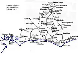 The London, Brighton and South Coast Railway (LB&SCR (known also as the Brighton line, the Brighton Railway or the Brighton)) was a railway company in the United Kingdom from 1846 to 1922. Its territory formed a rough triangle, with London at its apex, practically the whole coastline of Sussex as its base, covering a large part of Surrey. It was bounded on its western side by the London and South Western Railway (L&SWR), which provided an alternative route to Portsmouth. On its eastern side the LB&SCR was bounded by the South Eastern Railway (SER)—later one component of the South Eastern and Chatham Railway (SE&CR)—which provided an alternative route to Bexhill, St Leonards-on-Sea, and Hastings. The LB&SCR had the most direct routes from London to the south coast seaside resorts of Brighton, Eastbourne, Worthing, Littlehampton and Bognor Regis, and to the ports of Newhaven and Shoreham-by-Sea. It served the inland towns and cities of Chichester, Horsham, East Grinstead and Lewes, and jointly served Croydon, Tunbridge Wells (preserved as the Spa Valley Railway), Dorking and Guildford. At the London end was a complicated suburban and outer-suburban network of lines emanating from London Bridge and Victoria, and shared interests in two cross-London lines.