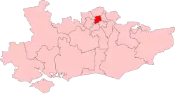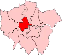 United Kingdom Parliamentary constituencies were redrawn in 1983 and the European constituencies were altered in 1984 to reflect this. The revised seat comprised the following Westminster constituencies: Chelsea, City of London and Westminster South, Fulham, Hampstead and Highgate, Holborn and St Pancras, Islington North, Islington South and Finsbury, Kensington and Westminster North.[2] The same boundaries were used in 1989 and 1994.[3][4]