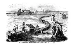 Work started on a 3 ft 8+1⁄2 in (1,130 mm) narrow gauge line from Euston to Holborn in September 1863.[8] The tubes were constructed by the Staveley Coal and Iron Company.[9] The first 'trains' ran on 10 October 1865 after a demonstration in which the chairman, Richard Temple-Grenville, 3rd Duke of Buckingham and Chandos, travelled from Holborn to Euston in one of the capsules.[10][11]