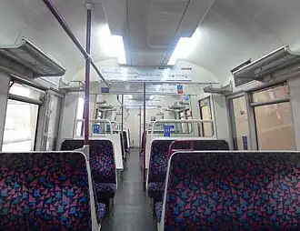 A distinctive feature was the use of transverse seating only, uncommon on the Underground. This is because it was designed for journeys which might last over an hour. Most of the seating was of the high-capacity transverse 2+3 arrangement.[14] Four tip-up seats were provided at the rear of the driving motor.[20] Despite each 8-car train seating 448 passengers,[18] the stock provided fewer seats than the locomotive-hauled and T stock trains that they replaced, but more seats than the S Stock which started to replace them from 31 July 2010.