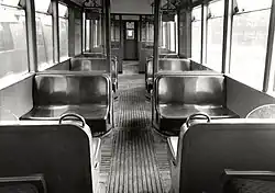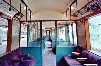 The 51-foot (16 m) long O Stock cars were fitted with air operated doors under the control of the guard. A car had 40 seats and two tip up and access was by two double doors and a single door on each side. Externally, the cars had side panels that flared at the bottom with no running boards to prevent passengers jumping on a moving train and attempting to open a door.[9] The trailers, with four extra seats,[3] had a hinged door at one end, locked closed in normal use, so they could be converted into driving motor cars.[5] Lighting was provided by incandescent bulbs in the ceiling.[3]